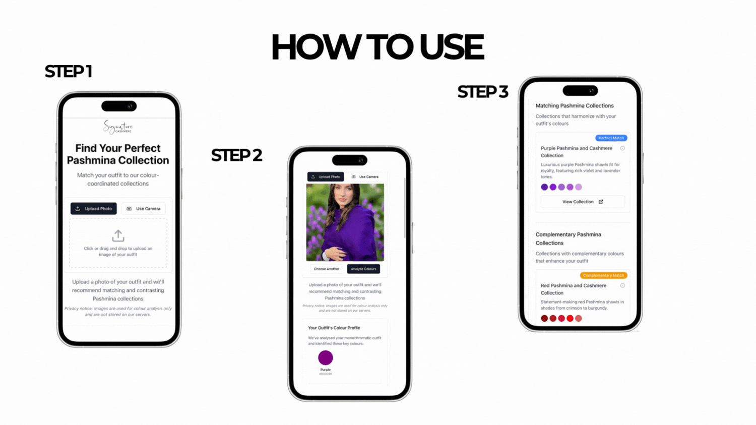 Let us help you find your ideal pashmina. Simply upload a photo and our colour-matching tool will suggest the perfect options for you.