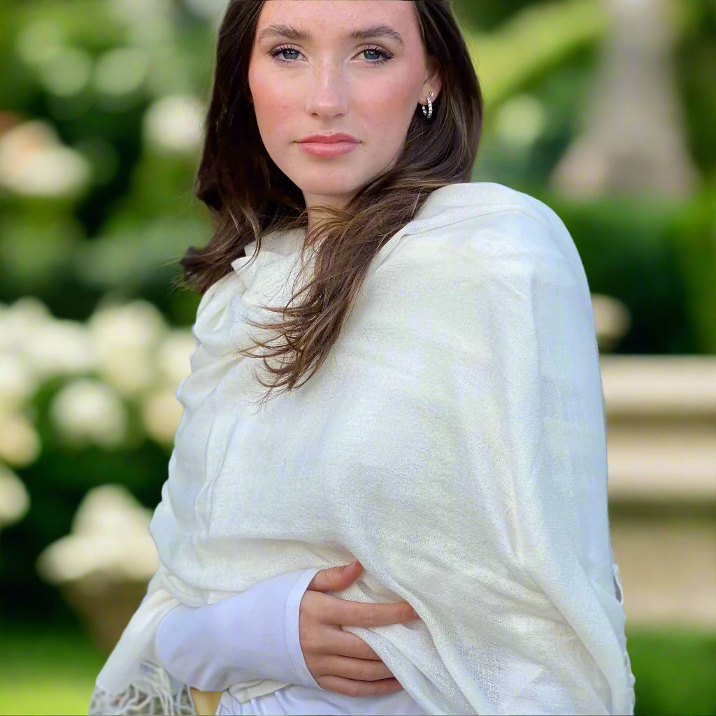 Our ivory cream ring pashmina has a delicate richness and a light and natural warmth that will enhance every ensemble. The ring pashmina is feather light and super soft and available in our most popular wrap and stole sizes. It is the perfect accessory for weddings, holidays, casual or formal wear and will add a touch of luxury to your wardrobe.